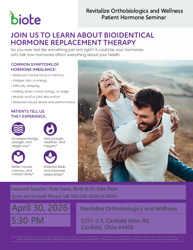 *Lab work is not included. We can provide you with a lab order to take to any LAB CORP location or lab work can be done here on site at Revitalize Orthobiologics and Wellness. Lab work must be done for initial visit, 10 weeks, 6 months, then annually.